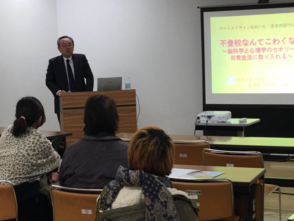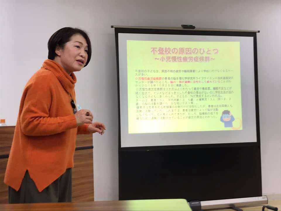 不登校の子どもは、原因不明の疲労や睡眠障害により学校に行けなくなるケースが多い。小児性慢性疲労症候群の患者の脳を調べると脳の一部が過剰に活性化して疲れるという興味深いお話から始まり脳科学と心理学の違いや脳のお話、昼夜逆転の原因と対策、さらにワーキングメモリーを強化する楽しいワークショップを体験できました。